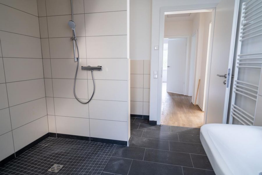 Einen angenehmen farblichen Kontrast bietet das Badezimmer. Dunkle Boden- und helle Wandfliesen werden von barrierefreier Dusche und Handtuchheizkörper ergänzt.