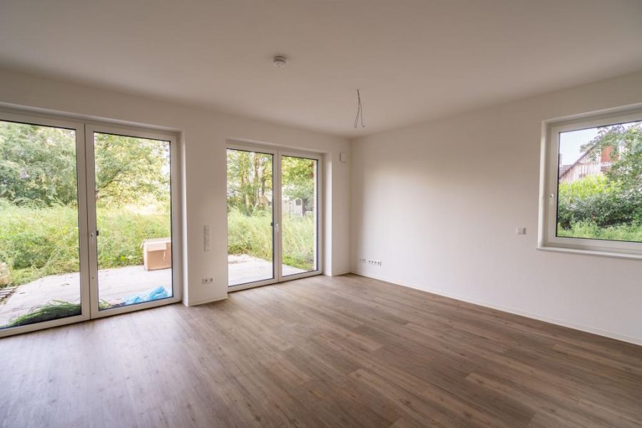 Durch den modernen, einheitlichen Designbodenbelag in Eichenoptik wird den Wohnräumen mehr Weite verliehen. Im Wohnzimmer sorgen zwei bodentiefe Türelemente sowie ein Fenster für Tageslicht en masse. Sowohl an der 4,70m langen Innenwand im Wohnzimmer als auch in allen anderen Räumen haben Sie dank der Fußbodenheizung deutlich mehr Flexibilität bei der Möblierung.