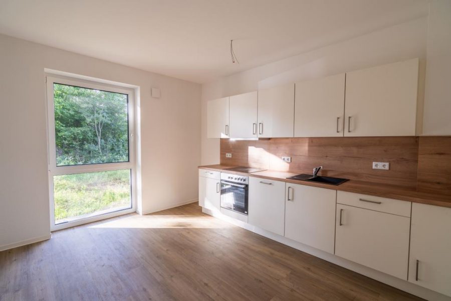 Die neue Einbauküche begeistert mit einer hellen Front, großer Arbeitsplatte, sechs Steckdosen und elektrischen Geräten wie Backofen, Ceranfeld und Spülmaschine. Ebenso findet hier der Esstisch seinen Platz. Im benachbarten Hauswirtschaftraum sind neben der Haustechnik auch die Anschlüsse für die Waschmaschine untergebracht.
