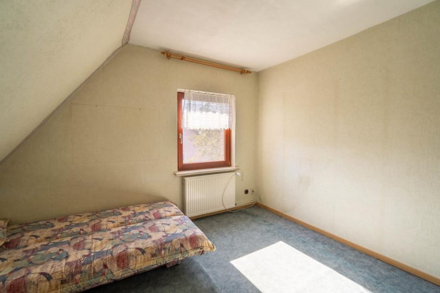 Je nach Bedürfnis und statischen Möglichkeiten können die Zimmer im Obergeschoss auch zusammengelegt und fortan dem Anspruch an einem modernen Wohnen dienen. Insbesondere das Badezimmer bedarf einer Renovierung und könnte in diesem Zusammenhang vergrößert werden.