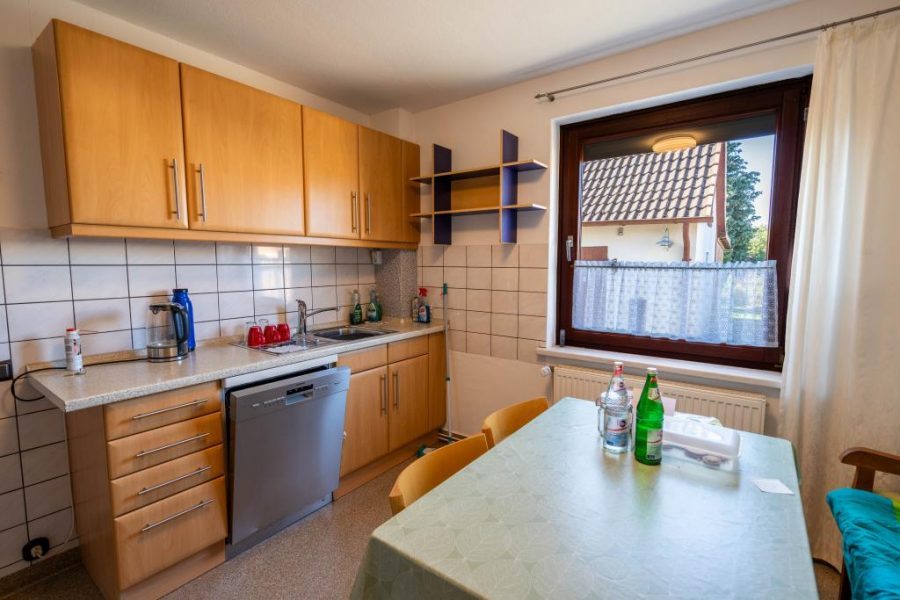 Praktisch über zwei Ecken ist die Einbauküche gebaut, sodass der Esstisch ebenfalls seinen Platz findet.