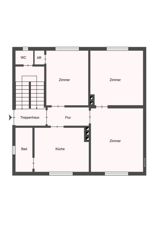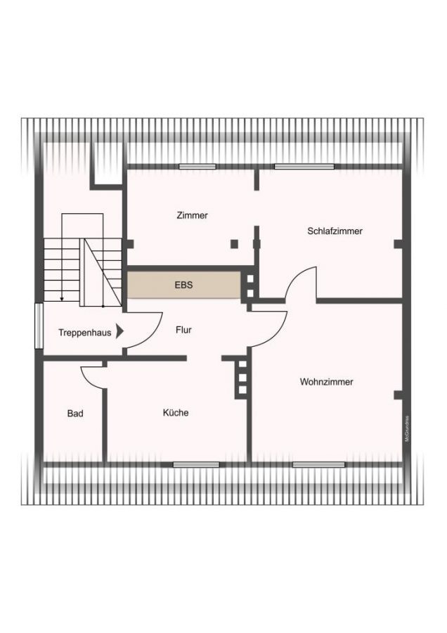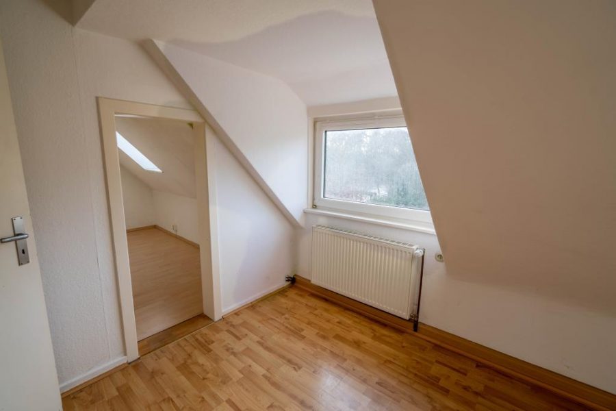 Etwas kleiner ist die Dachgeschosswohnung. Zwei vollwertige Zimmer und ein Nebenzimmer verteilen sich auf ca. 45m². Auch hier wird das Badezimmer über die Küche erreicht.