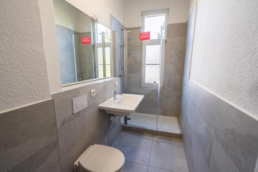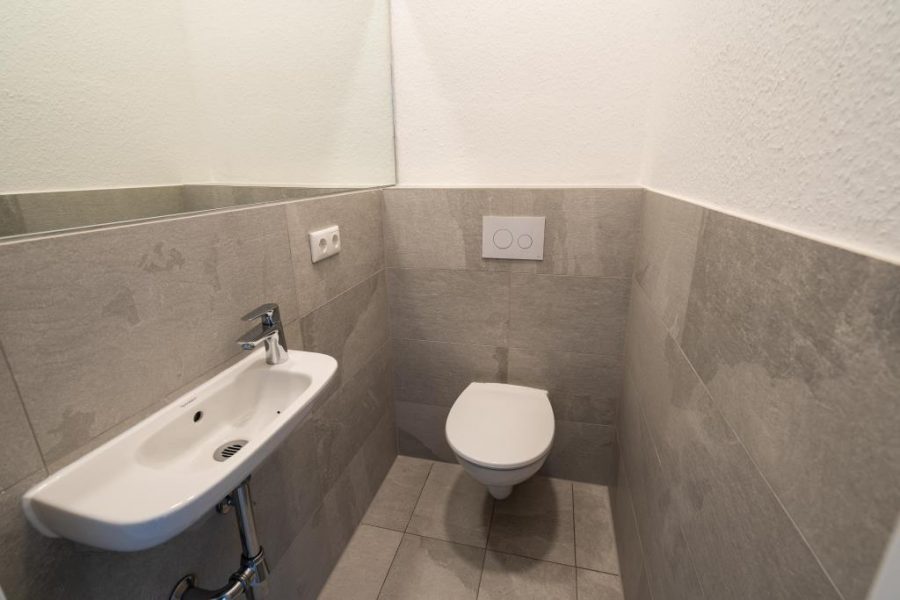 Das Badezimmer entspricht dank der Vorwandinstallation mit großer Ablagefläche, wandhängendem WC, Dusche mit geringer Einstiegshöhe und Fenster den heutigen Ansprüchen. Auch das Gäste-WC überzeugt mit großflächigen grauen Fliesen und ansprechenden Sanitärobjekten.