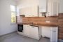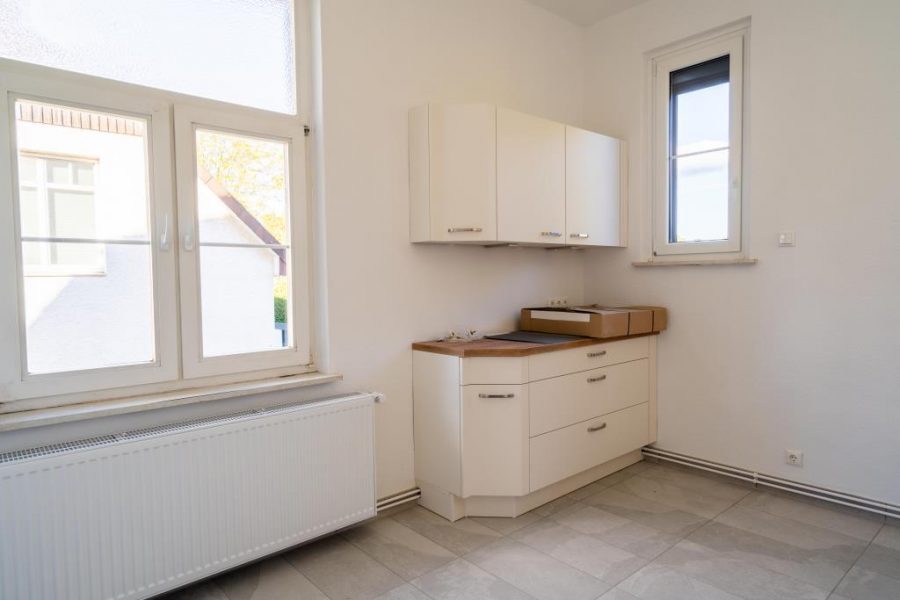 Die neu eingebaute Küche mit hellem Korpus und brauner Rückwand bietet mehrere Ober- und Unterschränke. Bis auf den Kühlschrank sind alle elektrischen Geräte wie Geschirrspüler, Backofen oder Herd vorhanden.